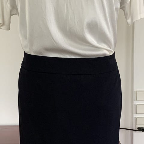 Trussardi Jeans nederdel i farven mørkeblå og i størrelse 46, i nederdelen står der størrelse 52, men det er et italiensk mål, det modsvarer cirka størrelse 46 i Danmark. Taljemålet er cirka 98 cm og længden cirka 58 cm, slidsen cirka 19 cm og lynlåsen cirka 16 cm. Bemærk at nederdelen er med galoner og med skrålommer i siden se billede 3. Bemærk at lynlåsen sidder på forsiden af nederdelen. Bemærk Trussardis firmasymbol som sidder bag på nederdelen se billede 5. De baglommer der kan ses på billederne er reelt kun til pynt, der er ingen reel lomme. Nederdelen er fremstillet af 97% bomuld og 3% elastan. Der er ikke for i nederdelen.