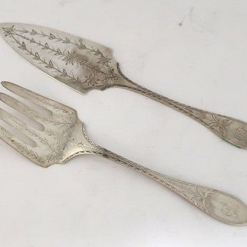 Totårnet sæt med en kæmpestor opøser og 18 middagsskeer i Empire mønster. Er ikke nypudset og i øvrigt svært at fotografere pga genskin. Opøseren er slidt yderst på bagsiden, se foto. Skeerne er i god stand - skal bare pudses.
