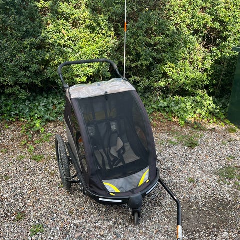 Winther Kangaroo cykelanhænger til børn med plads til to. Farve: blå. Materiale: robust stof og gennemsigtige plastikvinduer. Kører let og godt, egnet til transport af børn sikkert og komfortabelt.