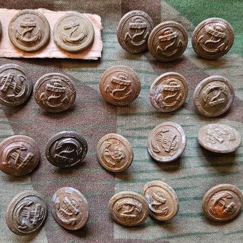 Blågrå og stemplet mk.5 og 1943 hvilket indikerer de formentligt er universelle knapper til alle værn, heer, luftwaffe, samt Waffen ss. Før da var det kun Luftwaffe der anvendte denne farve på deres knapper.