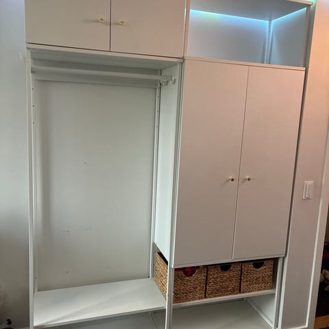 God brugt stand. Brugsspor, herunder mindre slid på stofbetræk og nogle få huller i stofbetrækket, men begge skabe fungerer som de skal. Kommer fra røgfrit hjem.