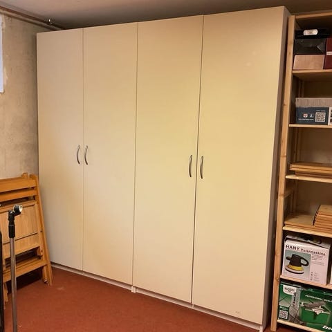 Skabene er lavet med let metalstel og betræk, som kan lynes op foran. Indvendigt findes bøjlestang, og der medfølger en blandet samling af bøjler. Skabene er adskilt og klar til transport.