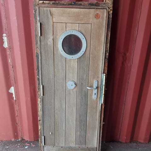 Styrhusdør 84,5x202cm i massivt hårdttræ med udskæring til rude, sparkeplade med drypnæse og metalbetrukket bundstykke. Åbner venstre ud. Træet er formentligt teak, men vides ikke med sikkerhed. Inderkarm måler 76,5x194,5x8,5cm. Døren har skruehuller på indvendig karm, brændmærker fra nedmonteringen, et beslag til at holde døren åben, en ødelagt liste, mangler en rude samt patina fra tiden på havet. Dimension B:84,5 X H:202 X D:7,5cm Døren har tidligere været brugt på en af Danmarks gamle isbrydere Danbjørn/Isbjørn. OBS: Malingen/lakken kan indeholde PCB. Indholdet er testet og alt er under de gældende grænseværdier. Dokumentation udleveres ved køb. Se evt. lignende artikler her: https://kingogenbrug.biz/vare/styrhusdoer-777x1985cm/