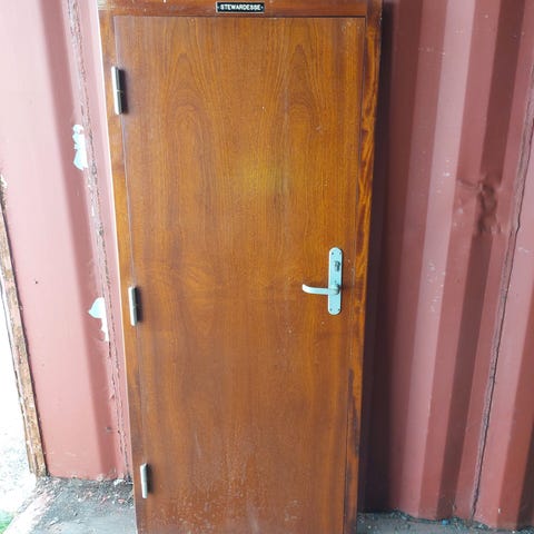 Mandskabsdør 73x186cm med dørventil og metalbetrukket bundstykke. Dørpladen synes at være opbygget af solidt træ og kraftig spånplade med pålimet teakfiner, se billeder. Karmen er lavet i massivt teak. Døren er venstre hængslet. Karmen har indbygningslæber, hvor den uden disse måler 69x184x2,5cm. Der medfølger ikke nøgle til den monterede cylinderlås. Kan have skruehuller, diverse beslag monteret, mindre skrammer, gammelt monterings materiale, mindre fejl i fineren samt patina fra tiden på havet. Dimension B:73 X H:186 X D:5,5cm. Døren har tidligere været brugt på en af Danmarks gamle isbrydere Danbjørn/Isbjørn. OBS: Malingen/lakken kan indeholde PCB. Indholdet er testet og alt er under de gældende grænseværdier. Dokumentation udleveres ved køb. Se evt. lignende artikler her: https://kingogenbrug.biz/vare/styrhusdoer-777x1985cm/ https://kingogenbrug.biz/vare/styrhusdoer-845x202cm-2/