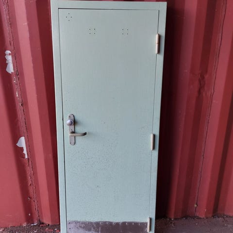 Mandskabsdør 73x186cm med metalbetrukket bundstykke. Dørpladen synes at være opbygget af solidt træ og kraftig spånplade med pålimet teakfiner, se billeder. Karmen er lavet i massivt teak. Døren er højre hængslet. Karmen har indbygningslæber, hvor den uden disse måler 69x184x2,5cm. Der medfølger ikke nøgle til den monterede cylinderlås. Dørpladen kan være to centimeter for kort i bunden for ventilation. Kan have skruehuller, diverse beslag monteret, mindre skrammer, gammelt monterings materiale, mindre fejl i fineren samt patina fra tiden på havet. Dimension B:73 X H:186 X D:5,5cm. Døren har tidligere været brugt på en af Danmarks gamle isbrydere Danbjørn/Isbjørn. OBS: Malingen/lakken kan indeholde PCB. Indholdet er testet og alt er under de gældende grænseværdier. Dokumentation udleveres ved køb. Se evt. lignende artikler her: https://kingogenbrug.biz/vare/styrhusdoer-777x1985cm/ https://kingogenbrug.biz/vare/styrhusdoer-845x202cm-2/ https://kingogenbrug.biz/vare/mandskabsdoer-73x186cm/