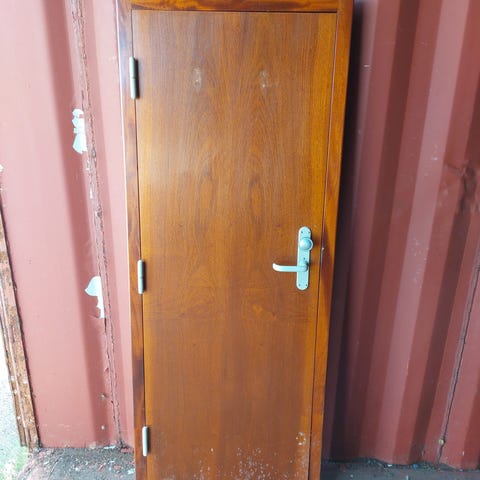 Mandskabsdør 73x182cm med sparkeplade og metalbetrukket bundstykke. Dørpladen synes at være opbygget af solidt træ og kraftig spånplade med pålimet teakfiner, se billeder. Karmen er lavet i massivt teak. Døren er venstre hængslet. Karmen har indbygningslæber, hvor den uden disse måler 69x178x5cm. Der medfølger ikke nøgle til den monterede cylinderlås. Dørpladen er to centimeter for kort i bunden for ventilation og er delvist malet. Kan have skruehuller, diverse beslag monteret, mindre skrammer, mindre fejl i fineren samt patina fra tiden på havet. Dimension B:73 X H:182 X D:6cm. Døren har tidligere været brugt på en af Danmarks gamle isbrydere Danbjørn/Isbjørn. OBS: Malingen/lakken kan indeholde PCB. Indholdet er testet og alt er under de gældende grænseværdier. Dokumentation udleveres ved køb. Se evt. lignende artikler her: https://kingogenbrug.biz/vare/styrhusdoer-777x1985cm/ https://kingogenbrug.biz/vare/styrhusdoer-845x202cm-2/ https://kingogenbrug.biz/vare/mandskabsdoer-73x186cm/