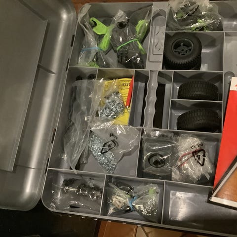 Kawada V500 Racers modelbygge sæt med detaljerede dele til samling af en racerbilsmodel. Indeholder flere poser med dele og en instruktionsbog for trinvis vejledning.