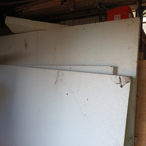 Tykke isoleringsplader, 2 stk, den ene mangler et mindre hjørnestykke, mål er ellers 88 x 119, tykkelsen er 310 mm. Til gulvvarme, kælderisolering, terrændæk isolering, gulvisolering