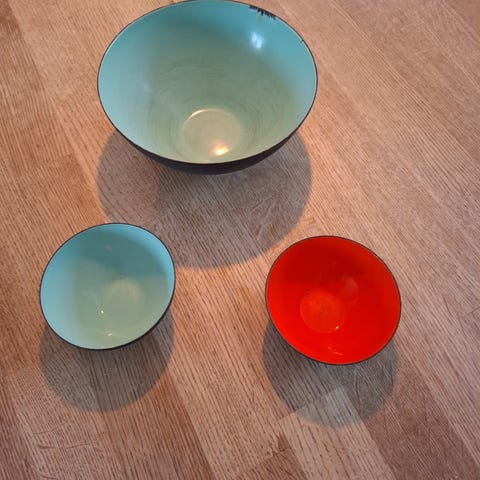 NY PRIS!! To originale KRENIT-emaljeskåle. Begge fra 50'erne og i rigtig fin stand med blank fin emalje, designet af Herbert Krenchel i 1953. Den ene med turkis emalje (lille emaljeafslag): H: 14 cm diameter: 25 cm. Den anden med limegrøn emalje H: 11 cm, diameter: 25 cm.
