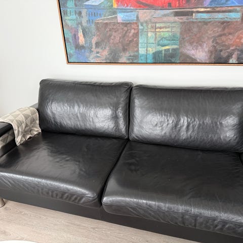 3 personers sofa i sort, slidstærkt læder med aftagelige hynder. Står som ny. Nypris 18.000