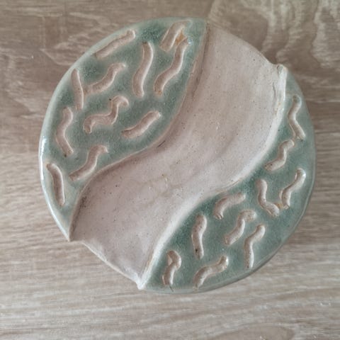 Den har en kraftig, struktureret overflade med en mørkeblå til brun glasur, som “løber” i overgangen. Den dekorative kæde-lignende ring omkring midten er et typisk træk fra Scheurich, Bay, eller ES-Keramik – nogle gange også Ü-Keramik.