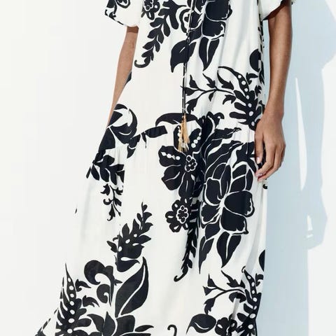 H&M maxi kjole i størrelse M med sort og hvid mønster. Kjolen har elastiske detaljer ved halsudskæring og ærmer, hvilket giver en justerbar pasform. Materialet er let og tekstureret. 100% viskose. Ikke ryger hjem. Kun brugt 2 gange. Brystmål 2 x 68 cm.