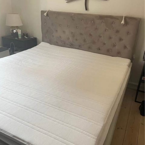 Rigtig flot seng, i meget pæn stand. Ingen pletter på madras eller topmadras, altid brugt med madras beskyttelse.