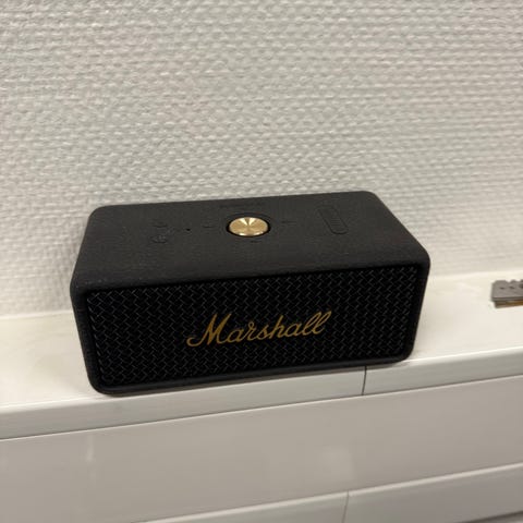Marshall Google Home Bluetooth højttaler i sort farve med trædetaljer. Højttaleren har et klassisk Marshall design med frontgitter og logo. Den har kontrolpanel med tre drejeknapper til lydstyrke, bas og diskant. Højttaleren er velegnet til trådløs afspilning via Bluetooth og kan tilsluttes med kabel. Materialet inkluderer træ og metal. Produktet er beregnet til brug i hjemmet eller andre indendørs miljøer.
