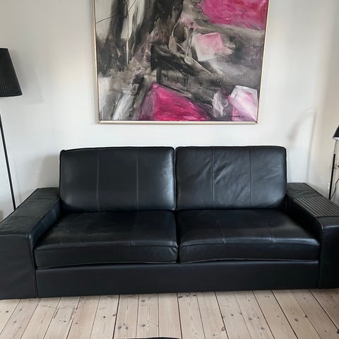 Sort lædersofa med “Grann” sort læder - blødt, stærkt. Let at rengøre. Kan let kombineres med andre Kivik moduler. Meget komfortabel og rummelig.