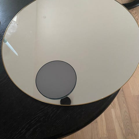 &Tradition rund spejlbakke med dekorative kanter i metal. Bakken har et spejl i midten med et enkelt bladmotiv. Egnet til opbevaring eller som dekorativ genstand i hjemmet. Bord spejl på 3 ben. Faset sliber spejl. Flot motiv på siden. Diameter 16,5 cm. Højde 3 cm. Pris 120 kr.