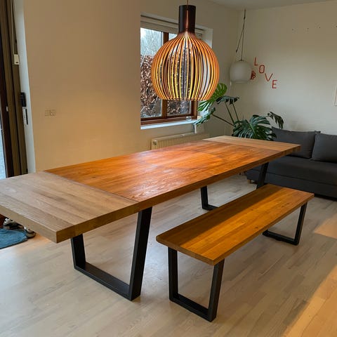Smukt spisebord i massiv eg med naturlig kant og råt, elegant udtryk. Bordet består af to solide planker, der giver et levende og naturligt look.