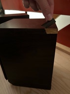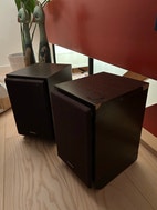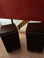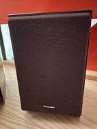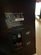 Mahognibrune højtalere, to styk af mærket Technics. Den ene har tabt en "strimmel" af fineren i toppen, som er limet på. Det er dog faldet af igen i hjørnerne (det ene hjørne haves).