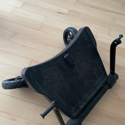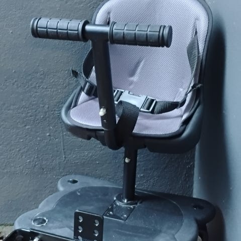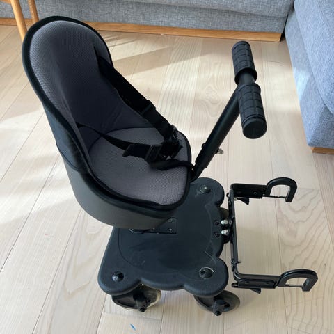 Easy Rider ståbræt med sæde/stol, med sele. Desuden lys (skiftende farver) i hjulene når de er i bevægelse. Nemt at fastlåse på barnevogn eller klapvogn. Sædet kan skures af, så brættet kun bruges til at stå på (og holde ved fx barnevogn).