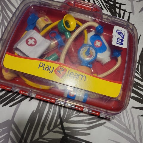 Fint lille doktor sæt i træ. Sprøjte med fjeder, medicinflaske med aftageligt låg, saks hat osv