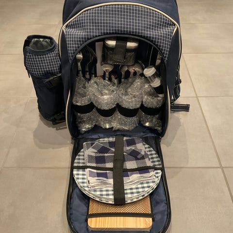 Praktisk rygsæk med picnic udstyr, kølerum og seperat flaske køler. Indeholder bestik og tallerkener til 4 personer, lille skærebræt, ostekniv og holdere til 4 glas/kopper.