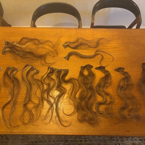 Flot syntetisk mintgrønt hår, påsat et hårelastik. Aldrig brugt. Det er 42 cm langt. Extensions.