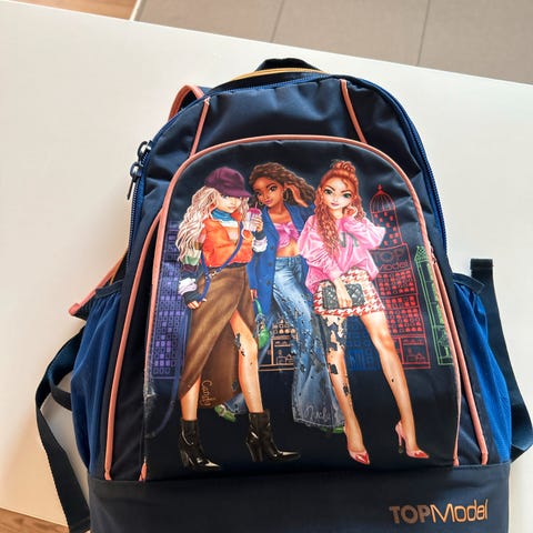 Skoletaske, Topmodel, Skoletaske med tilhørende penalhus. Ideelt til barnet der gerne vil repræsenteres af et motiv, der ligner hende selv :) Brugt et skoleår.
