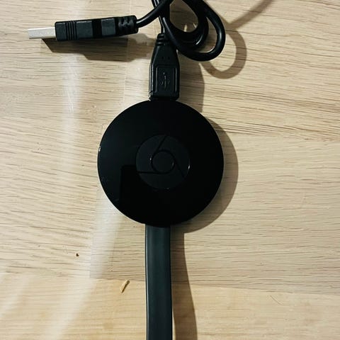 Google Chromecast streaming-enhed i sort farve. Enheden tilsluttes via HDMI og bruges til at streame indhold fra mobile enheder eller computere til et TV. Kompatibel med forskellige apps og platforme til medieafspilning.