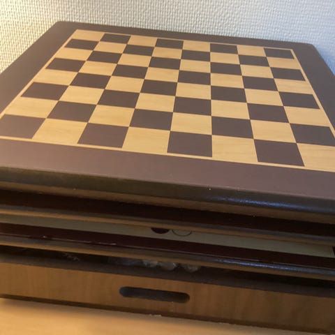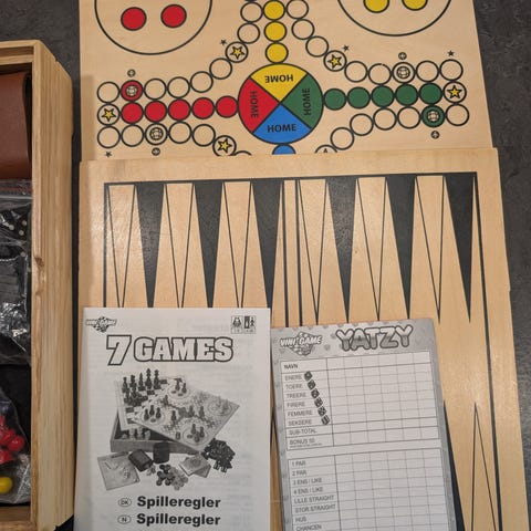Lille og kompakt trækasse (ca. 15 cm) med klassiske spil: skak, dam, mikado, domino og kortbrikker.
