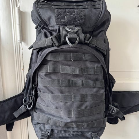 Under Armour Tactical Rygsæk i sort farve. Rygsækken har polstrede skulderstropper og flere lommer, herunder en frontlomme med MOLLE-system til ekstra tilbehør. Materialet er holdbart og egnet til daglig brug eller udendørs aktiviteter. Rygsækken har også sidelommer til opbevaring af flasker eller småting.