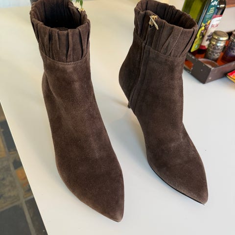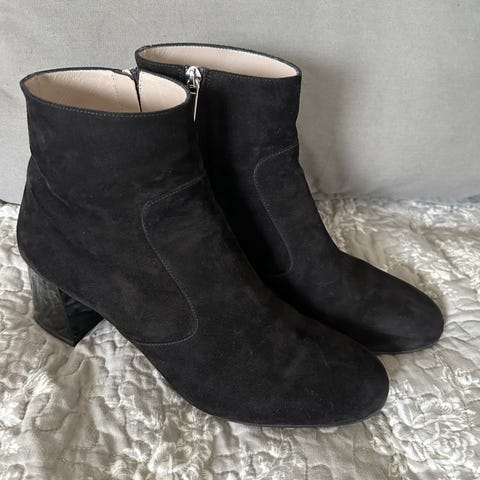 Materialet er blødt ruskind og læder, og er normal i størrelsen, - også egnet til brede fødder.
