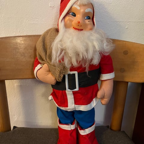 Denne gamle nisse i keramisk materiale, har på et tidspunkt "brækket" sin venstre arm. Men den er repareret så fint og han bærer stadig gaver med begge arme. Han er i pæn stand. Se billederne.