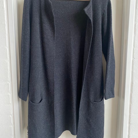 Smuk klassisk sort Mary cardigan fra Sibin Linnebjerg, perlestrikket i en behagelig lun merinokvalitet. Cardiganen har længde til lige over knæet, er uden lukning, har hellange ærmer og to forlommer.