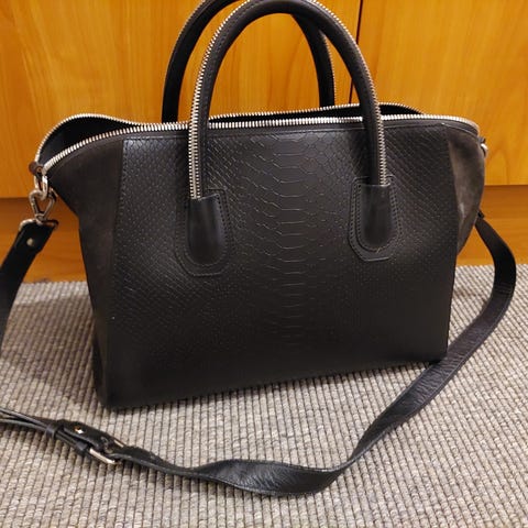 Grå skuldertaske fra Elsk, måler cirka 37x35 cm.