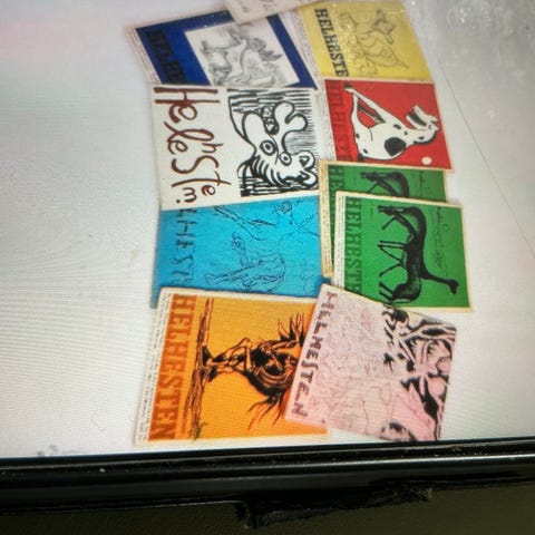 Helhesten - Tidsskrift for kunst - 2. Årgang - Hæfte 5-6 - side 98-172. Stand som fremgår af billederne uden skade til de interne litografier. Indeholder alle illustrationer, der er kun taget billeder af de med farve. Illustrationer fra Carl Henning Pedersen, Asger Jorn, Dan Sterup Hansen, Richard Mortensen, Olivia Holm Møller, Ib Gertsen, Else Alfelt og Ejler Bille