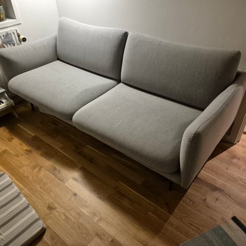 Det er god tilstand. Det er 3*2 sofa. Det er grå farve. Ben kan Adskillelse fra sofa. Ben er sort farve og træ kvalitet.