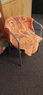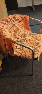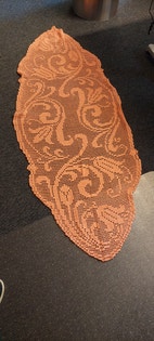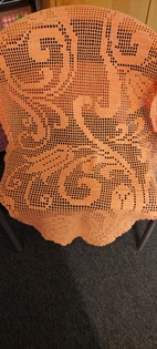 Håndlavet hæklet dug i svag orange/fersken farve med mønster. Kan anvendes som borddækning eller som dekorativt tæppe på stole eller små borde. Materialet er tekstil med fin hækling, hvilket giver et let og luftigt udseende.