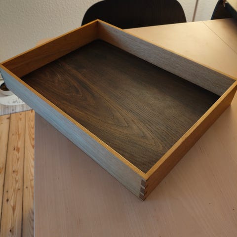 Serveringsbakke/anretningsbakke fremstillet af upcyclet egetræ, med detaljer i messing, behandlet med linolie. Håndlavet og unik.