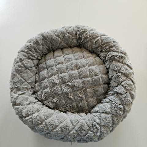 Grå Pels katte/Hundeseng Sæt bestående af to stykker i forskellige størrelser. Senge er runde med blødt, pelsagtigt materiale, designet til at give komfort til katte/hunde.