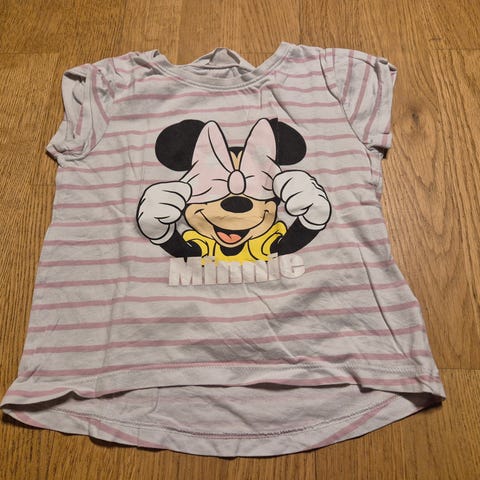 T-shirt med Minnie Mouse. Der er glimmer i solbriller, sløjfe og skrift.