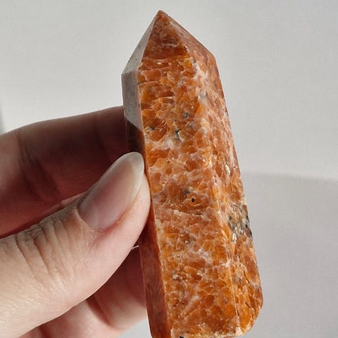Her er et flot tårn af solsten med blå apatit inklusioner. Måler ca. 8cm og vejer 56g.