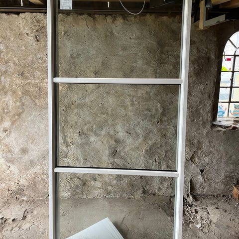 Fintoo trekantet vindue med hvid ramme. Vinduet har en unik trekantet form og er velegnet til gavl. Materialet er glas med en træramme malet i hvid. Vinduet dimensioner fremgår på billede 2