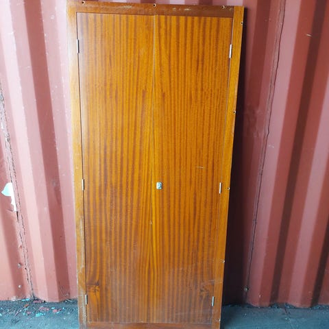 Indbygningsskabsfront 91,3x180,5cm med teakfiner på lågerne og karm i massivt teak. Uden indbygningslæberne på karmen måler den 87x176,5cm. Karmen har monteringshuller, fineren har mindre skrammer samt der er patina fra tiden på havet. Dimension B:91,3 X H:180,5 X D:3cm Døren har tidligere været brugt på en af Danmarks gamle isbrydere Danbjørn/Isbjørn. OBS: Malingen/lakken kan indeholde PCB. Indholdet er testet og alt er under de gældende grænseværdier. Dokumentation udleveres ved køb. Se evt. lignende artikler her: https://kingogenbrug.biz/vare/mandskabsdoer-73x186cm/ https://kingogenbrug.biz/vare/svingdoer-895x201cm/ https://kingogenbrug.biz/vare/indbygningsskabsfront-84x1825cm/