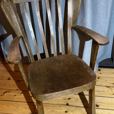 Gammel træstol med fint betræk og armlæn. Står stabilt . Masser af sjæl, charme og patina. Giv et bud.