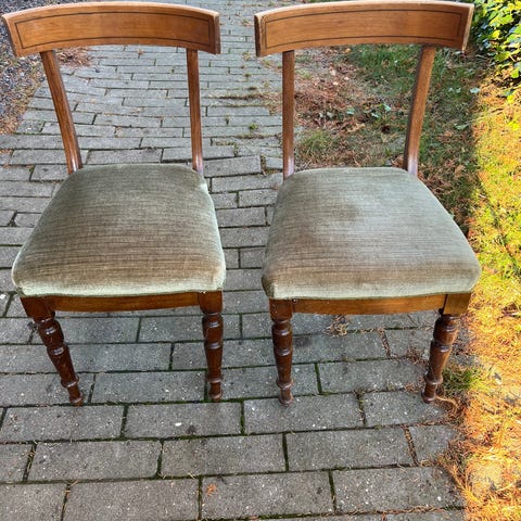 Stolene er malet i mørkegrøn med lysegrå ryglæn. De har det klassiske design med spinkle pinde i ryggen og massivt sæde.