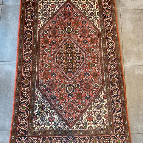 Persisk tæppe, Bijar. Tæppet er i meget fin stand. Se info på billedet med seddel fra Rezvadi i Aarhus, hvor tæppet er købt.
