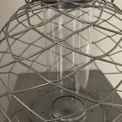 Helt ny og dekorativ foder kugle til ophæng. Indvendigt metalnet til nødder eller solsikkekerner. Forneden i kuglen er der en opsamlings plade til de nødderester fuglene griser med. Fyldes nemt oppefra mens den hænger på sin plads. Kuglen rundt om forhindrer de store fugle i at "stjæle" maden. Frithængende og rottesikret. I original emballage.