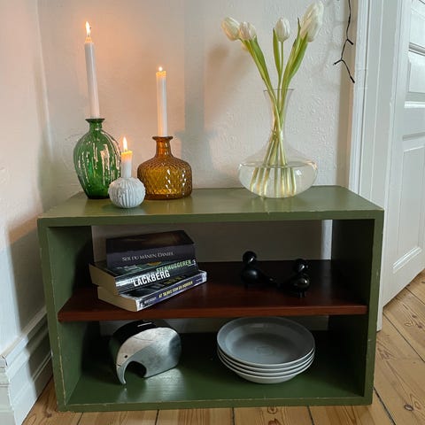 Den måler: L 55 cm, B 22 cm og H 35 cm