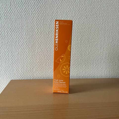 Ole Henriksen Truth Juice Daily Cleanser er en ansigtsrens i en 60 ml tube. Produktet har en orange emballage og indeholder ingredienser, der er designet til daglig rengøring af huden. Tuben er lavet af blødt materiale, der gør det nemt at dosere produktet.