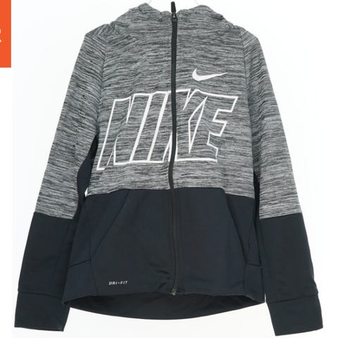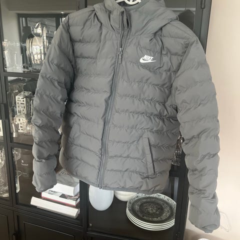 Nike Dri-FIT jakke i børnestørrelse 146, rigtig fin til generel brug men også rigtig god til fodboldtræning. Jakken er mørkeblå og lavet i let materiale med Dri-FIT teknologi, som hjælper med at holde barnet tørt under aktivitet. Vindtæt og vandafvisende.Den har hætte og lynlås foran.